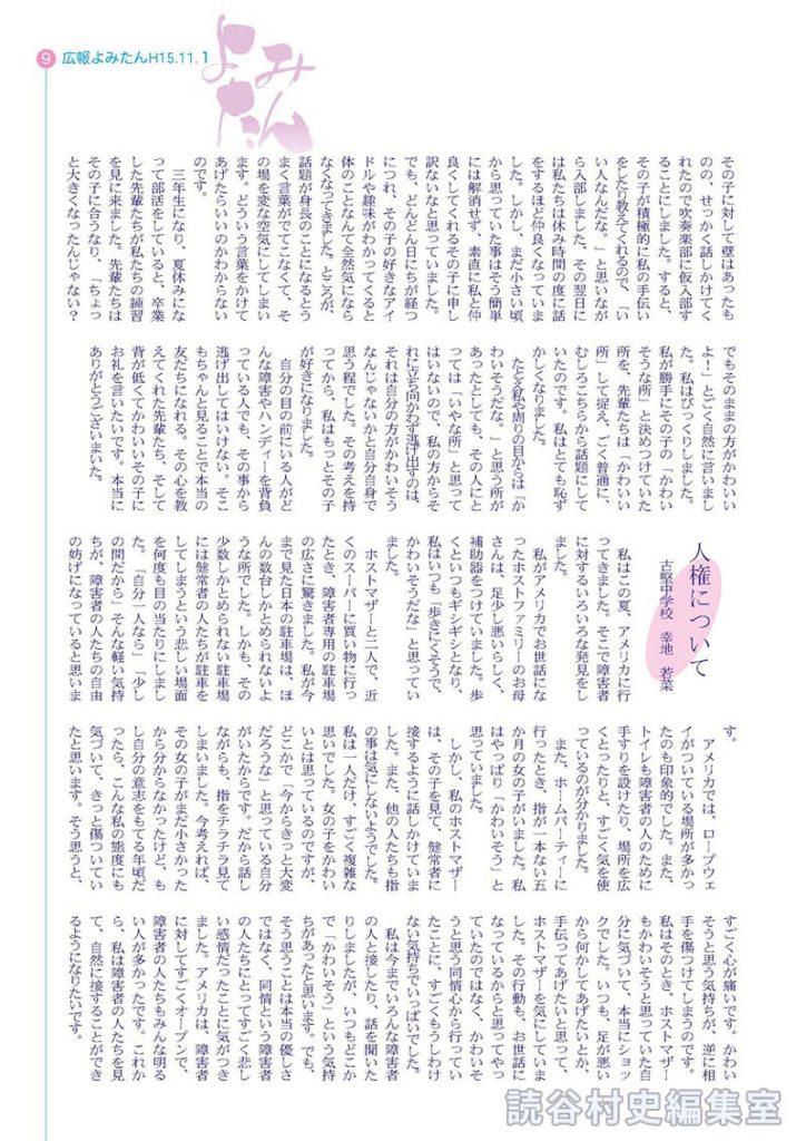 私は今までいろんな障害者の人と接したり、話を聞いたりしましたが、いつもどこかで「かわいそう」という気持ちがあったと思います。でも、そう思うことは本当の優しさではなく、同情という障害者の人たちにとってすごく悲しい感情だったことに気がつきました。アメリカは、障害者に対してすごくオープンで、障害者の人たちもみんな明るい人が多かったです。これから、私は障害者の人たちを見て、自然に接することができるようになりたいです。