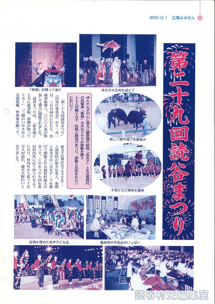 読谷まつりは、「新北風とともに進貢船、泰期が帰ってくる!」「三線のいやさかと五穀豊穣、世果報を願って、赤犬子の神が天下り下さる!」と読谷村の偉大な先人、泰期と赤犬子の二大モチーフを掲げて開催される読谷村最大のまつり。このまつりも回を重ね県内外に広く知らるよになり、村内外から延べ十五万人が訪れ、連日大賑わいとなりました。