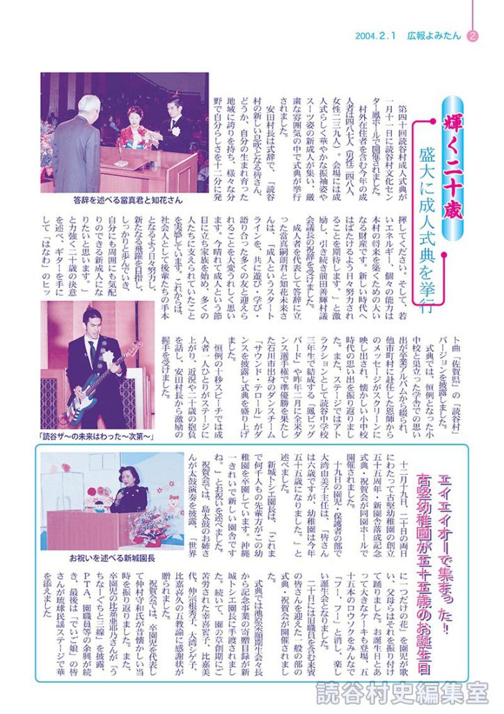 祝賀会では、卒園児を代表して仲村守和氏が昔懐かしい当時を振り返りました。また、卒園児の比嘉亜耶乃さんが「うちなーぐちと三線」を披露、PTA、園職員等の余興が続き、最後は「でいご娘」の皆さんが琉球民謡ステージで華を添えました。