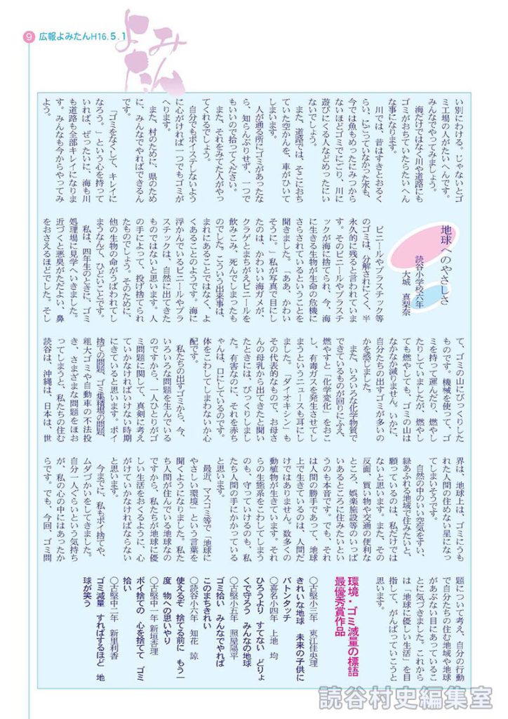 私たちの出すゴミから、今、いろいろな問題を生んでいるのですから、一人ひとりがゴミ問題に関して、真剣に考えていかなければいけない時期にきていると思います。ポイ捨ての問題、ゴミ集積場の問題、粗大ゴミや自動車の不法投き、さまざまな問題をほおってしまうと、私たちの住む読谷は、沖縄は、日本は、世界は、地球上は、ゴミにうもれた人間の住めない星になってしまいそうです。