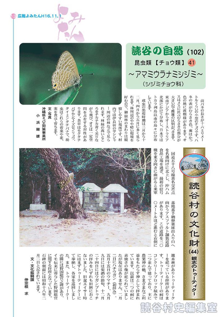 成虫の出現時期は三月から十二月。四月から五月に多く見られます。林周辺のやや暗い環境を好むので、御嶽林のまわりは観察しやすい場所です。村内では伊良皆のサシジャー周辺の林などで見られます。林縁の高いところをチカチカ青く光りながら飛び、オスは一定空間を占有する習性があります。食草はモクタチバナやシマイズセンリョウ、タイミンタチバナで、幼虫はこれらの若葉や花、実を食べて育ちます。