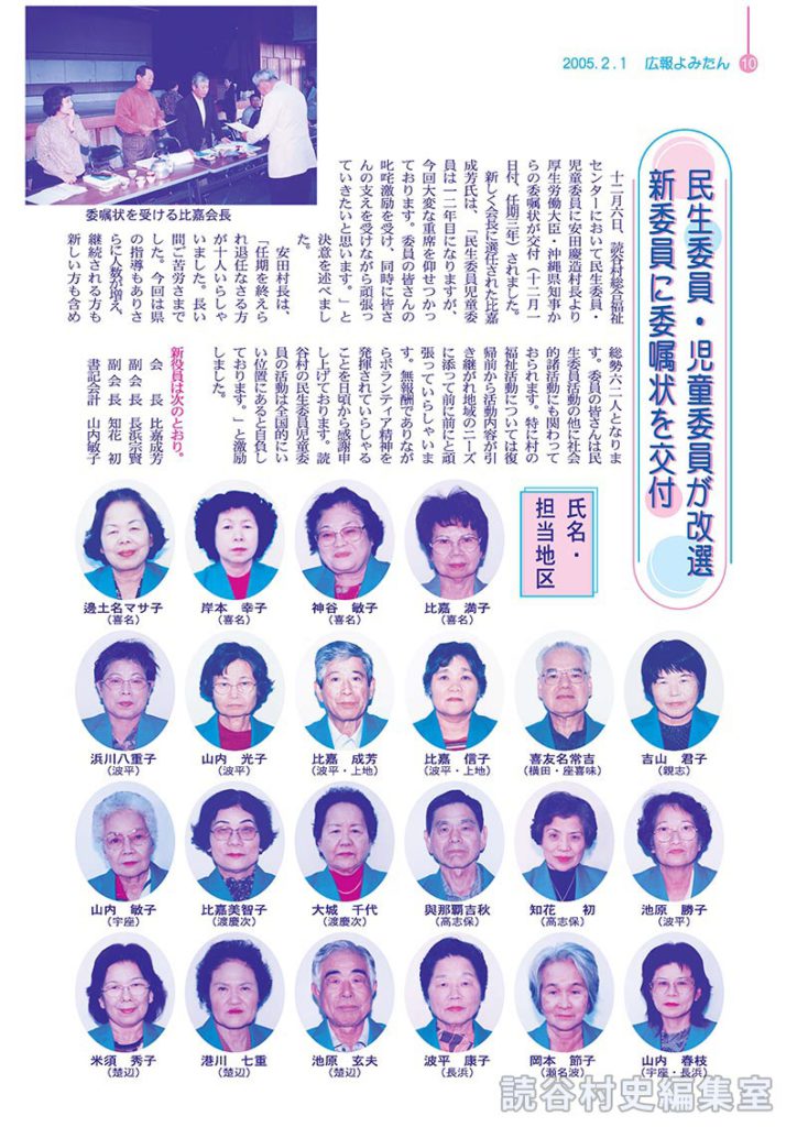 比嘉満子(喜名) 神谷敏子(喜名) 岸本幸子(喜名) 邊土名マサ子(喜名) 吉山君子(親志) 喜友名常吉(横田・座喜味) 比嘉信子(波平・上地) 比嘉成芳(波平・上地) 山内光子(波平) 浜川八重子(波平) 池原勝子(波平) 知花初(高志保) 與那覇吉秋(高志保) 大城千代(渡慶次) 比嘉美智子(渡慶次) 山内敏子(宇座) 山内春枝(宇座・長浜) 岡本節子(瀬名波) 波平康子(長浜) 池原玄夫(楚辺) 港川七重(楚辺) 米須秀子(楚辺) 比嘉恵子(大添) 大城強(大添) 小橋側好子(大木) 長浜宗賢(大木) 仲栄真ミネヨ(大木) 松田光子(伊良皆) 平良喜代子(伊良皆) 宮平裕子(伊良皆) 稲福智善(比謝) 大城政子(比謝) 大城良子(大湾) 松田末(大湾) 伊波スミ子(大湾・古堅) 池原頼子(古堅) 松田菊成(渡具知) 波平稔(渡具知) 宇栄原宗介(大湾・長田) 名嘉真朝徳(長田) 宮城光子(比謝矼) 比嘉清順(村全域) 城間広次(村全域) 比嘉智恵子(新、座喜味) 島袋和枝(新、座喜味) 大城義和(新、高志保) 松田栄光(新、楚辺) 照屋清善(新、楚辺) 伊波禮子(新、古堅) 大城千鶴子(新、村全域) 仲村律子(新、渡慶次) 上地春子(新、波平) 阿波根直則(新、都屋) 仲里久子(新、瀬名波) 波平春美(新、喜名) 上地千賀子(新、楚辺) 宮平和美(新、高志保) 安里孝子(新、横田・親志)