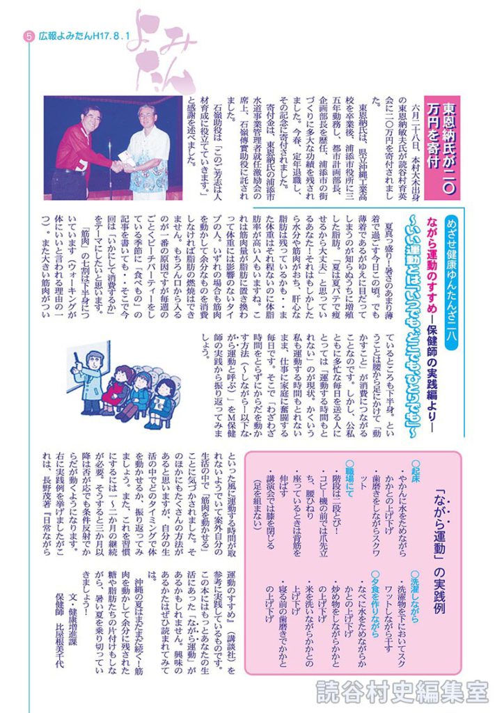 六月二十八日、本村大木出身の東恩納敏夫氏が読谷村育英会に二〇万円を寄付されました。