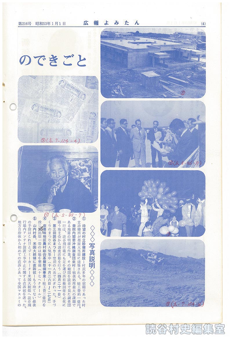 カメラでみる1977年のできごと ①待望の村立診療所建設ー村民多年の宿願であった村立診療所が部屋大当原に建築される。総工費約一億円。 ②衆院内閣委沖縄調査団来村ー戦後処理最大の課題である地籍の明確化作業。その縮図を読谷で見た調査団一行は、読谷飛行場にも足を運び所有権回復を必死に願う地主会から調査活動を行う(四月二十一日) ③第三回読谷まつりー空前の人出でにぎわった。手づくりのまつりに人気集中(十一月二六日~二七日) ④座喜味地区農村総合基盤整備事情ー総工費三億円を投じ前田原一帯のほ場を整備(十七ヘクタール) ⑤山内村長、米国大統領に直訴状ーもう待てない最後の手段はこれ!!とジミーカーター米国大統領へ読谷飛行場内アンテナ設置工事中止に関する直訴状を送った。地方自治体から初めての直訴とあって全国マスコミの ※写真は原本参照